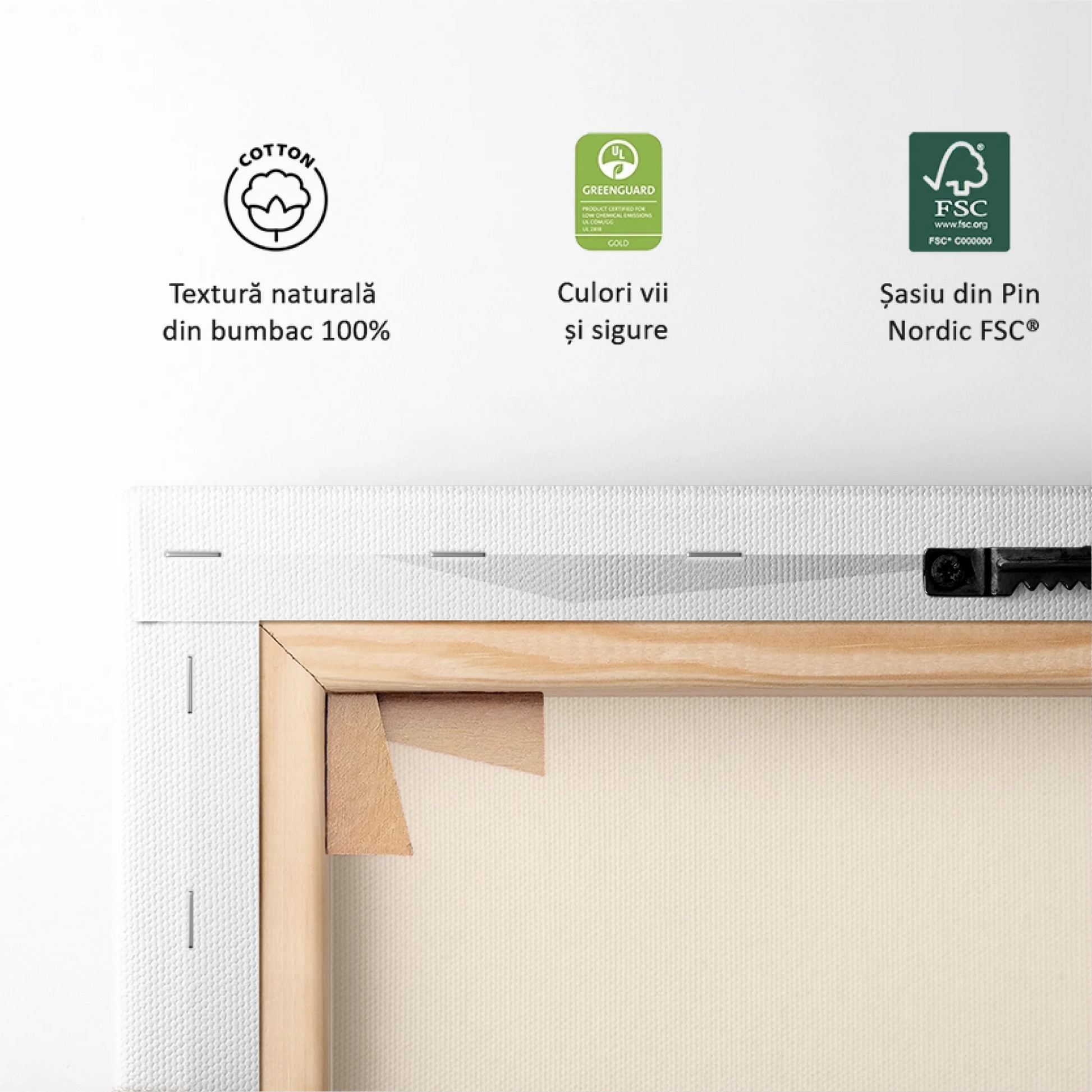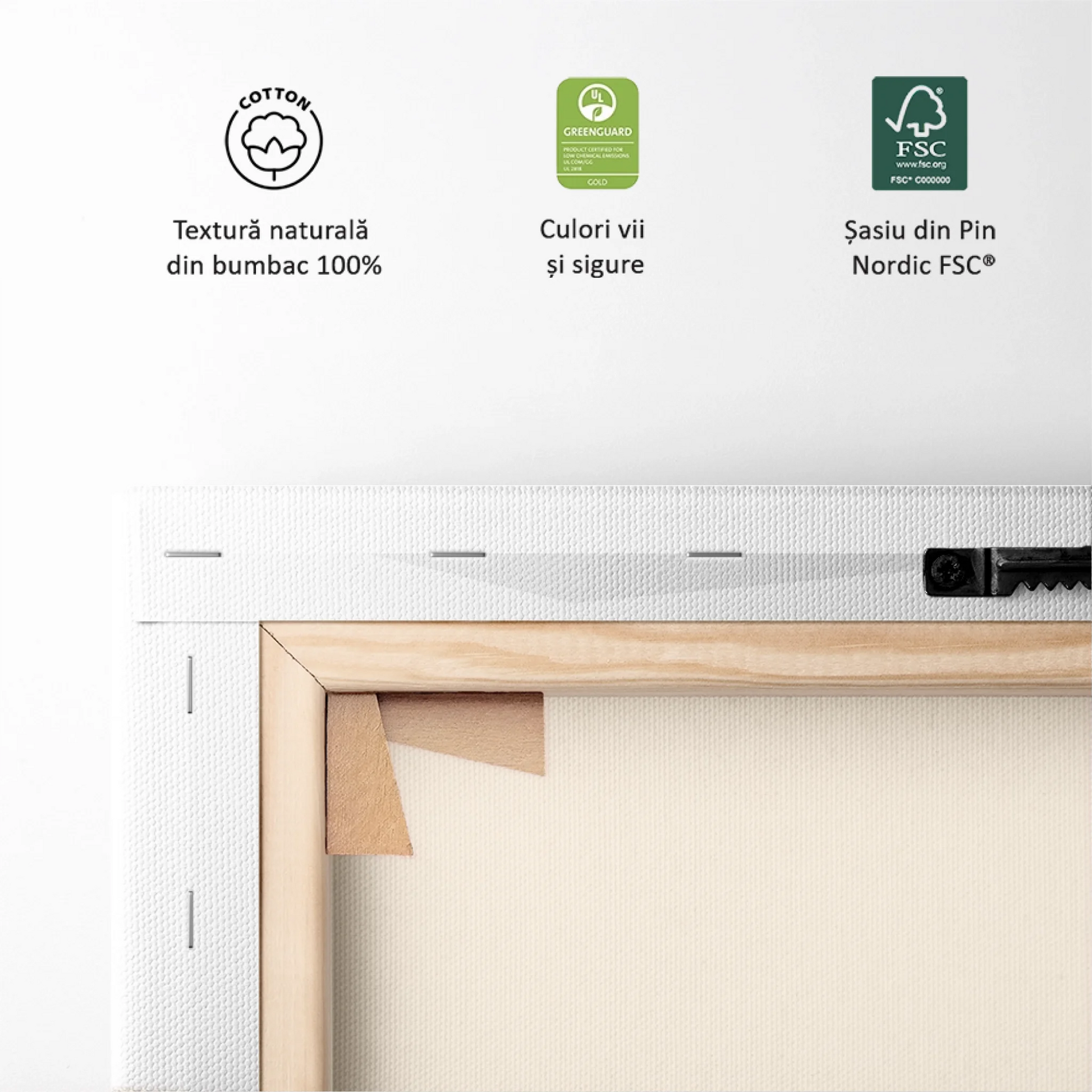 Pânza întinsă pe lemn de pin nordic — tabloul rămâne perfect drept.